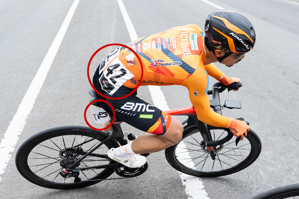 ゼッケンは「サドル後ろ」と「腰」にあります。
